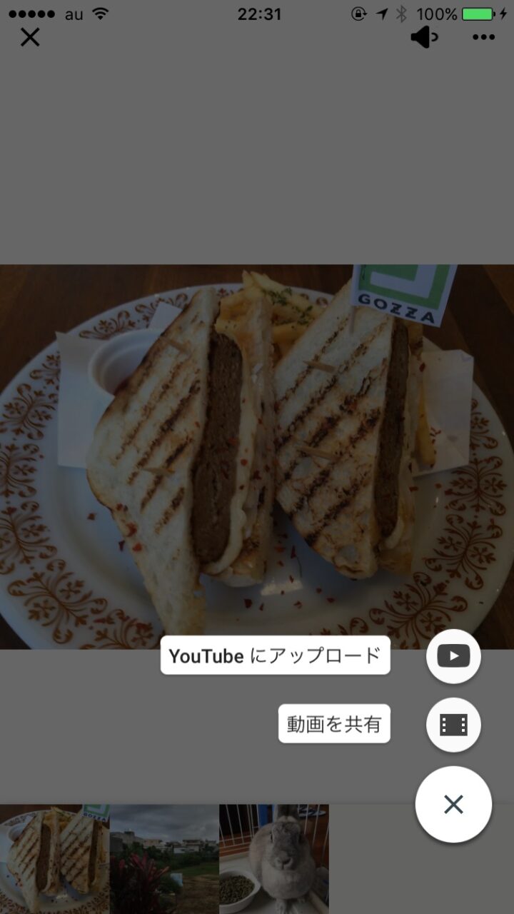 連結して作成したムービーは再生アイコンを押すことでプレビュー表示となり、更に共有アイコンをタッチすることで、MOV ファイル形式の動画として共有したり、更にそのまま「YouTube」にアップロードすることも可能となります。