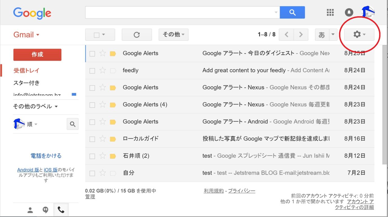 デスクトップ版「Gmail」に POP 形式のメールアカウントを登録する方法は、「Gmail」ページの右上にある歯車マークをクリックして、表示される項目から “設定” をクリックします。