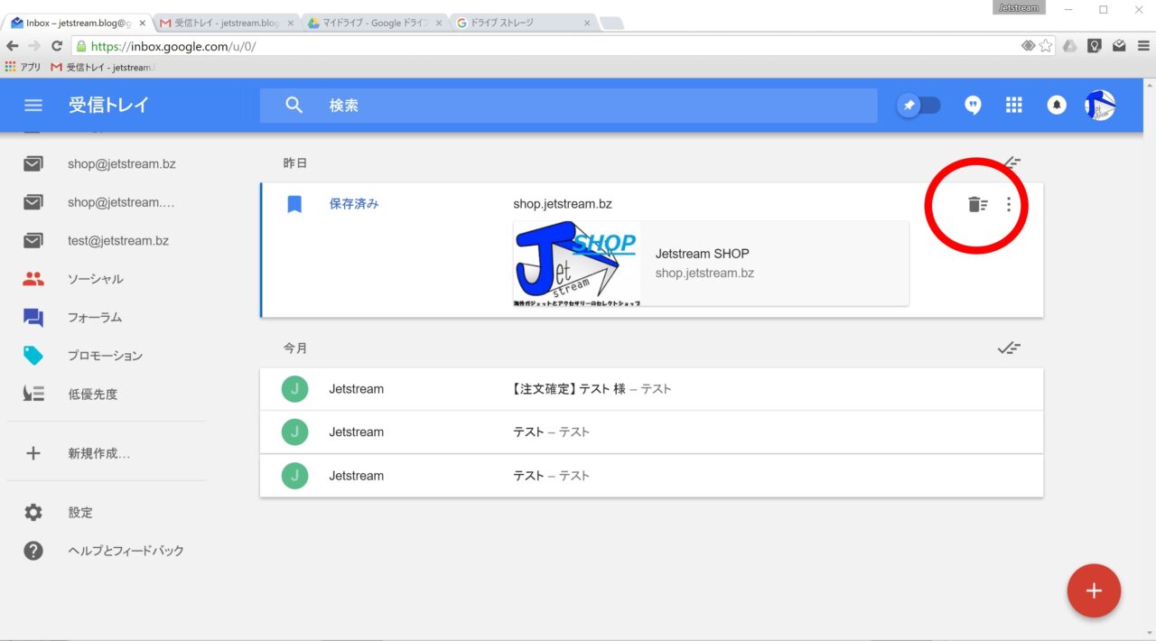 “完了” でアーカイブ化されたメッセージは削除されずに残り続けるため、その分の Google ストレージ容量を消費します。