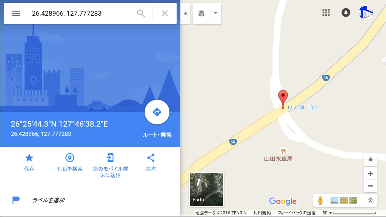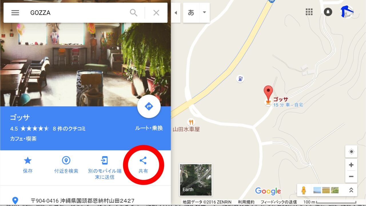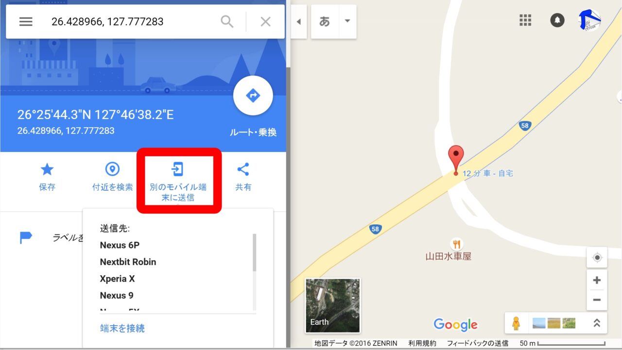 ちなみにスポット情報のバーの中にある “別のモバイル端末に送信” をクリックすると、同じ Google アカウントでログインしている自分のスマートフォンにスポット情報を転送することができ、自身のナビゲーション用としてもスマートに利用することができます。