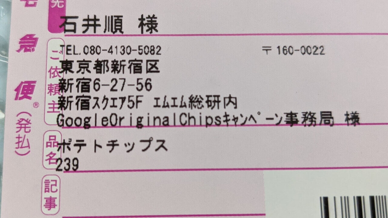 私もキャンペーン開始と共に速攻でキャンペーン登録を行っていたのですが、そのキャンペーン商品となる先着 10,000 名限定ユーザー名入りオリジナルチップス「Google Original Chips」が、2021 年 10 月 1 日に無事に我が家に届きました。配達してくれたのは、ヤマト運輸さん。