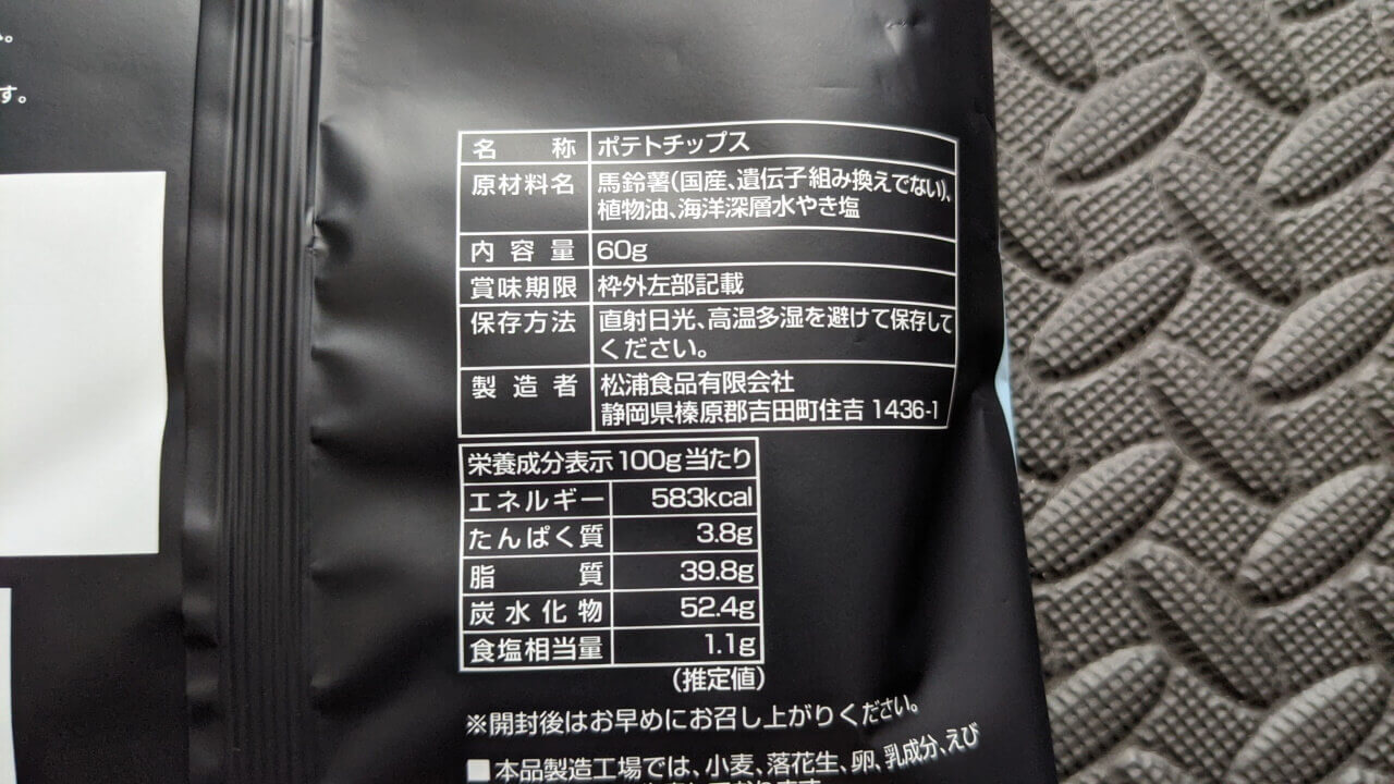 「Google Original Chips」内容量は 60g、100g 当たりののエネルギー量は 583kcal です。つまり 583 ÷ 100 × 60 で、「Google Original Chips」1 パッケージ当たりのエネルギー量は約 350kcal ですね。ポテチということで、脂質と炭水化物量は流石多め。