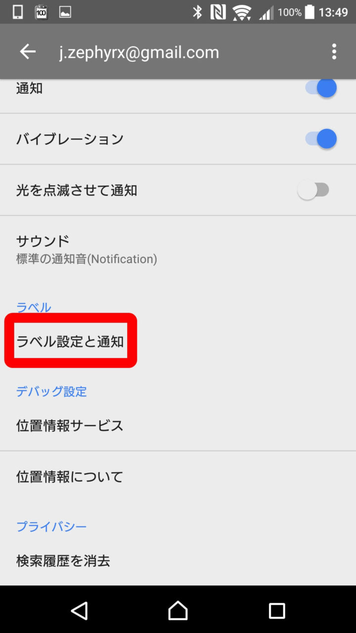 ラベルごとの通知を ON にする設定は、先ほどの “設定” から、“ラベルの設定と通知” をタッチします。