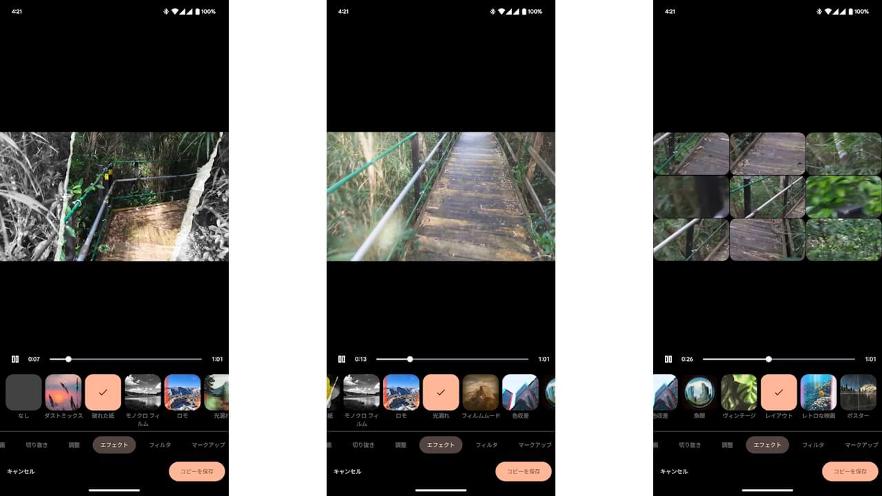 Android 版「Google フォト」アプリに新しく追加された動画編集機能[エフェクト]は、[破れた紙][モノクロ フィルム][魚眼]など、動画に対して様々なエフェクトを適用できる機能です。現時点では、[ダストミックス][破れた紙][のも黒 フィルム][ロモ][光漏れ][フィルムムード][色収差][魚眼][ヴィンテージ][レイアウト][レトロな映画][ポスター]の合計 12 個のエフェクトが用意されています。