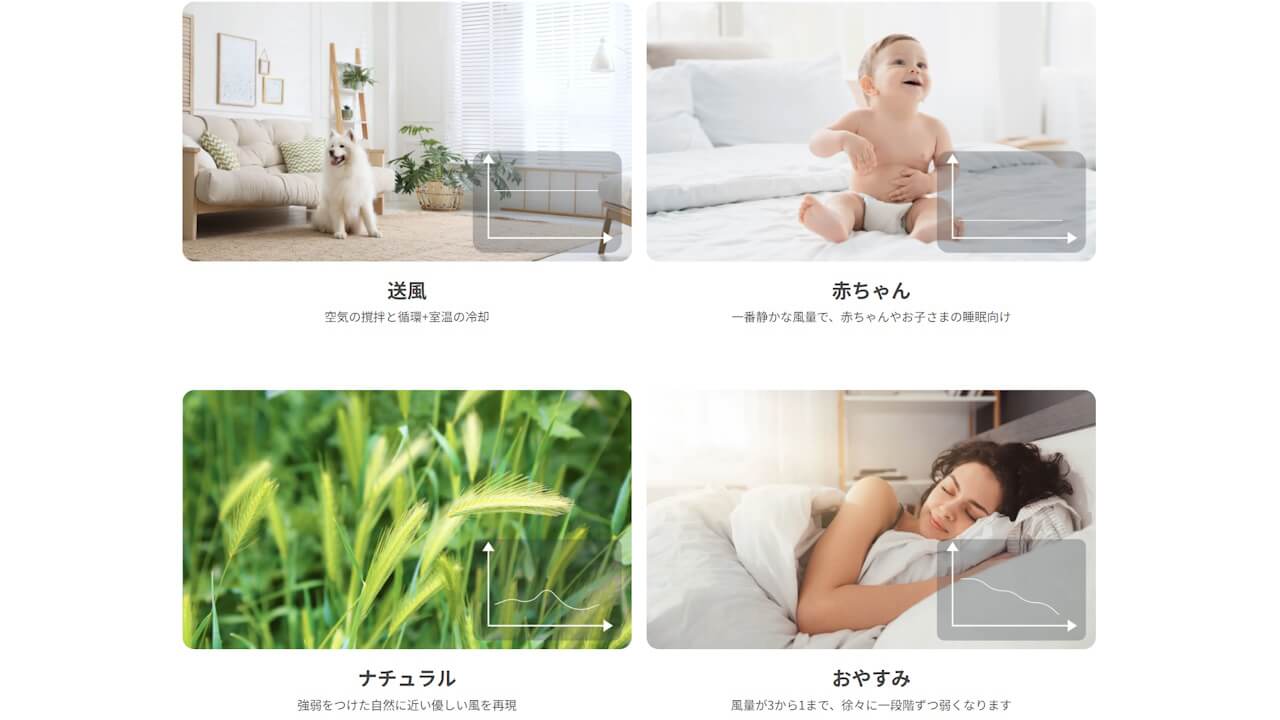 送風モードも、ノーマルに部屋の空気を循環させる[送風]、赤ちゃんやペット向けに静かな風量で送風する[赤ちゃん]、自然の風を近い優しい風を再現する[ナチュラル]、風量が 3 から 1 まで徐々に弱くなる睡眠時用モード[おやすみ]と、4 つのモードを搭載します。