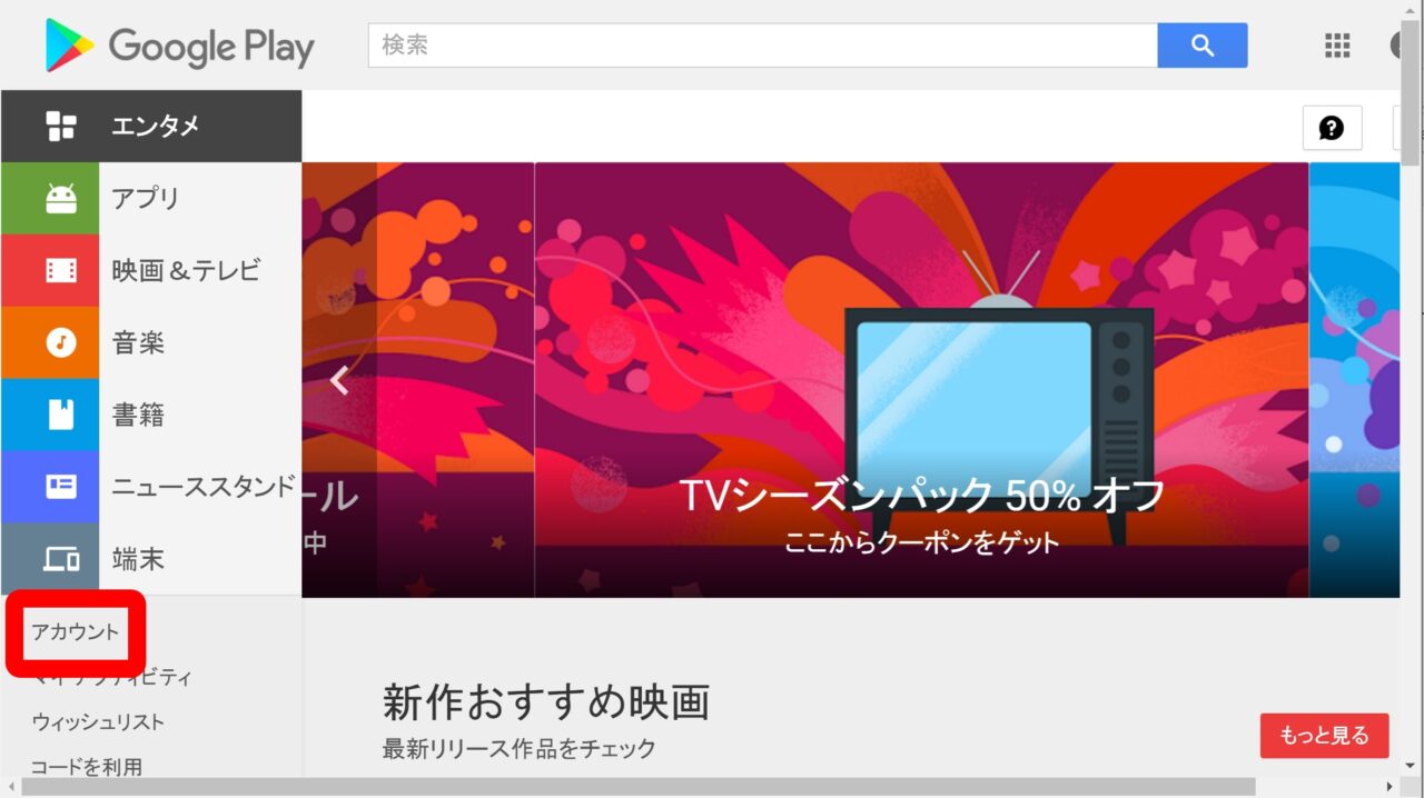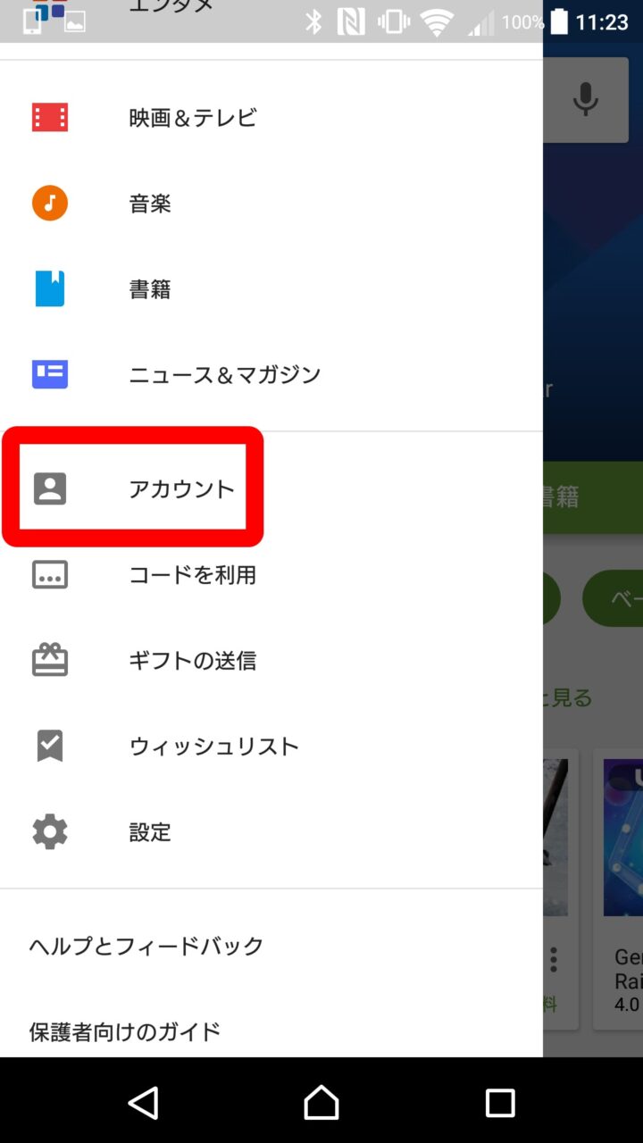 「ファミリーライブラリ」の設定は Android とデスクトップで行うことが可能です。まず Android の場合です。Google Play ストアを起動して、メニューアイコンをタッチし、”アカウント” をタッチします。