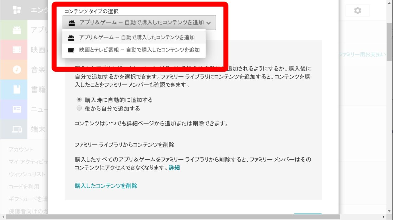 「ファミリーライブラリ」の設定は、”アプリとゲーム” と、”映画 & テレビ” のそれぞれで設定できるようになっています。どちらかとタッチして、”購入時に自動的に追加する” か、”後から自分で追加する” を選択すれば完了です。