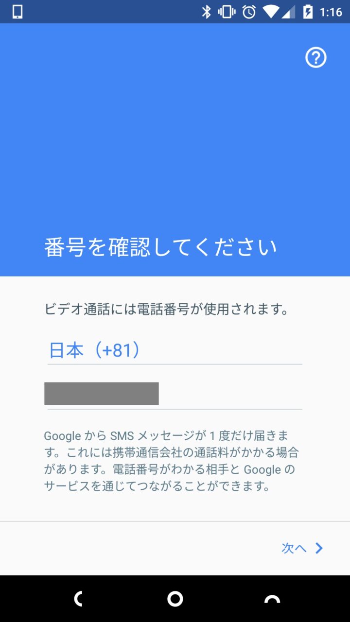 「Google Duo」のセットアップは簡単です。まずアプリをインストールして起動し、はじめにスマートフォンの電話番号を利用して SMS 認証を行います。SMS が利用できる SIM を際している状態であれば特に難しい操作もなく自動で認証が行われ、すぐに利用できるようになります。