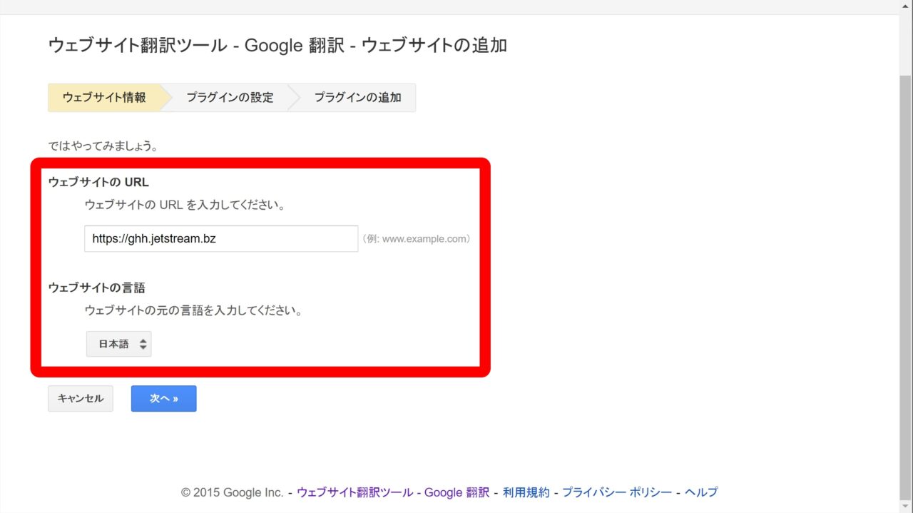 次のページで「ウェブサイト翻訳ツール」を導入する “ウェブサイトの URL” を入力し、更に “ウェブサイトの言語” を選択します。言語は翻訳する言語ではなく、ウェブサイトの基本言語です。つまり基本的には日本語になるかと思います。