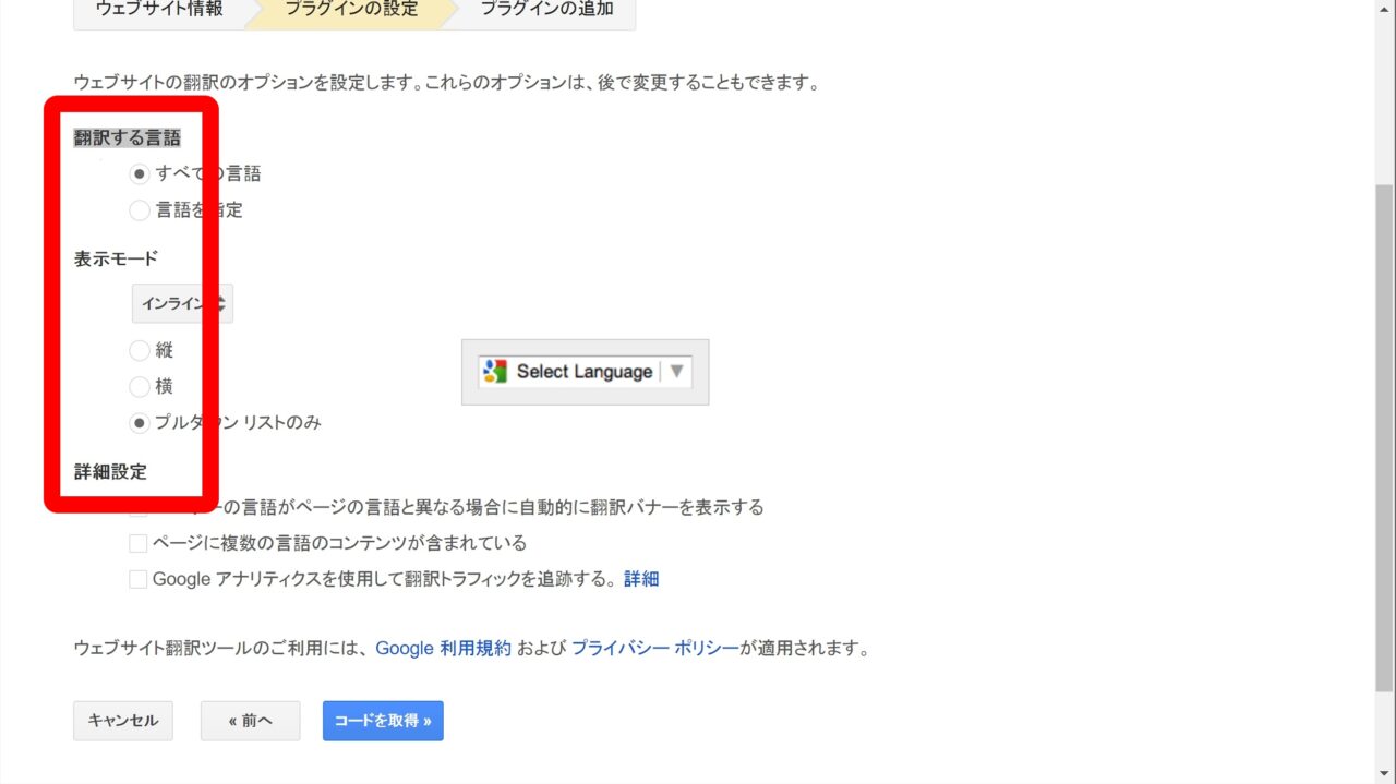 次のページで “翻訳する言語” “表示モード” “詳細設定” の 3 つを設定します。