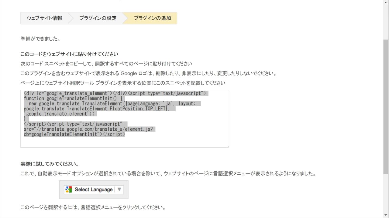 以上を設定したら、“コードを取得” をクリックします。すると次のページで、各設定を反映させた “コード スニペット” が生成されます。