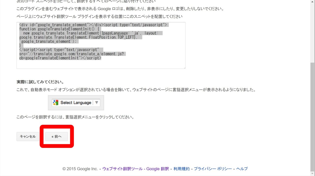ちなみにツールバーのデザインを変更したい場合などは “前へ” をクリックして戻ることで、何度でも “コード スニペット” を生成し直すことができます。