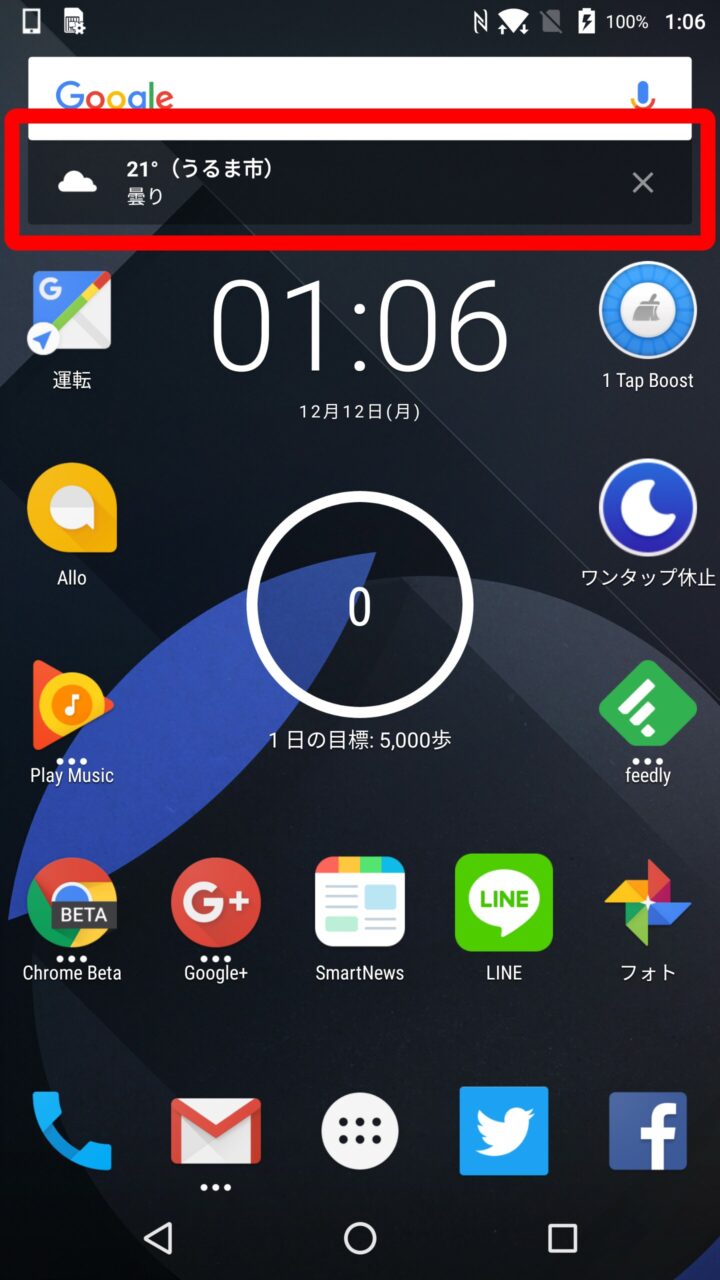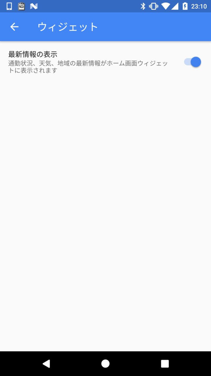 “ウィジェット” のスイッチを オン にしておくことで、“通勤状況” “天気” “地域の最新情報” といった「Google Now」で表示される一部の情報が、ランダムで表示されるわけです。