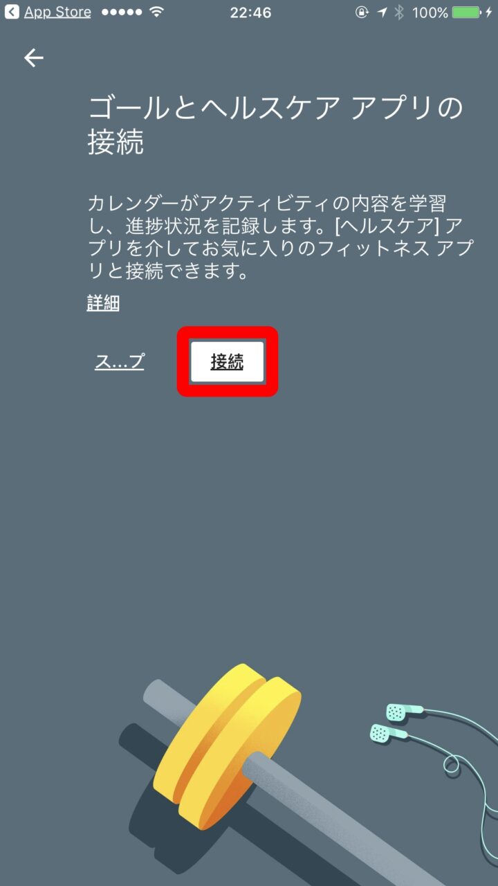 “都合の良い時間” まで設定すると、ヘルスケア アプリへの接続が求められるので、“接続” をタッチして進みます。また初回は「Google カレンダー」のヘルスケア アプリへのデータのアクセス許可が求められるので、“ワークアウト” のスイッチを オン にして右上の “許可” をタッチします。