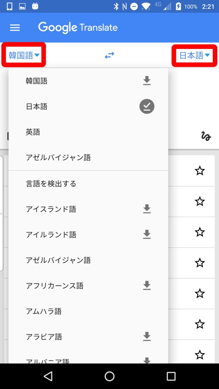 スマートフォン版「Google 翻訳」アプリで “カメラモード” を利用する方法は、「Google 翻訳」アプリを起動して、まずは翻訳する元言語と翻訳後の言語を設定します。画面左上に表示されるのが元の言語、右上が翻訳後の言語です。