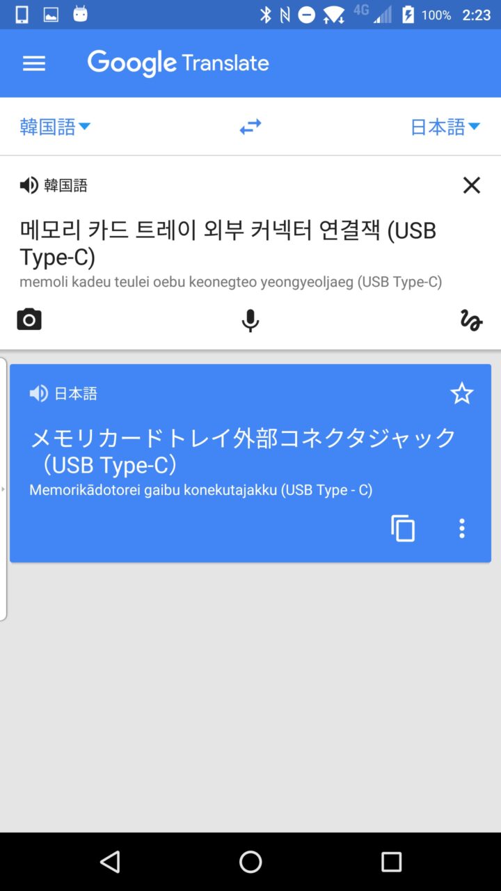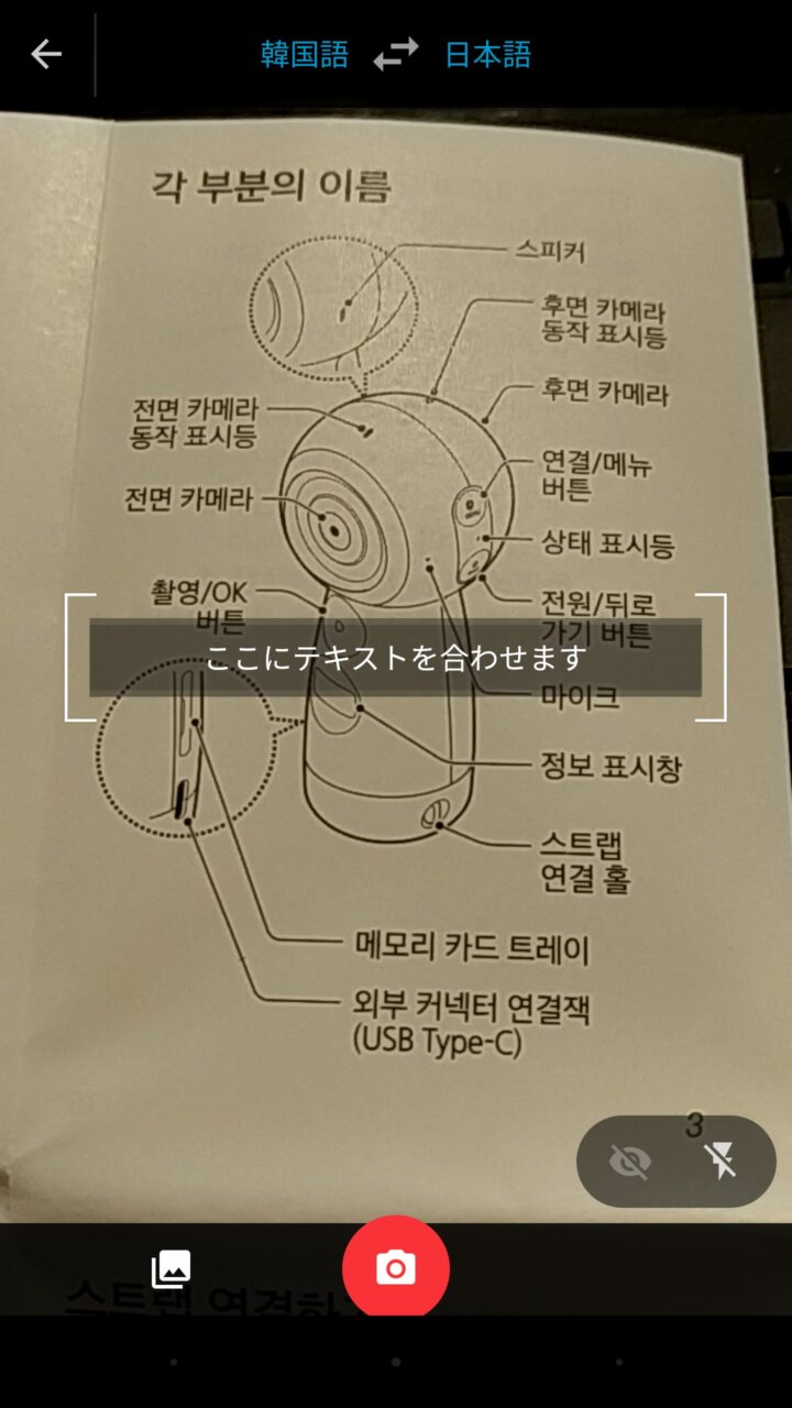 以前ご紹介させていただいたリアルタイム翻訳機能の “Word Lens” は、この “カメラモード” が進化した機能なのですが、2017 年 4 月末現在は日本語関連の翻訳では英語のリアルタイム翻訳にしか対応していません。しかし “カメラ”モード” は多くの言語をサポートしているので、英語以外の言語を日本語に翻訳する際に便利です。