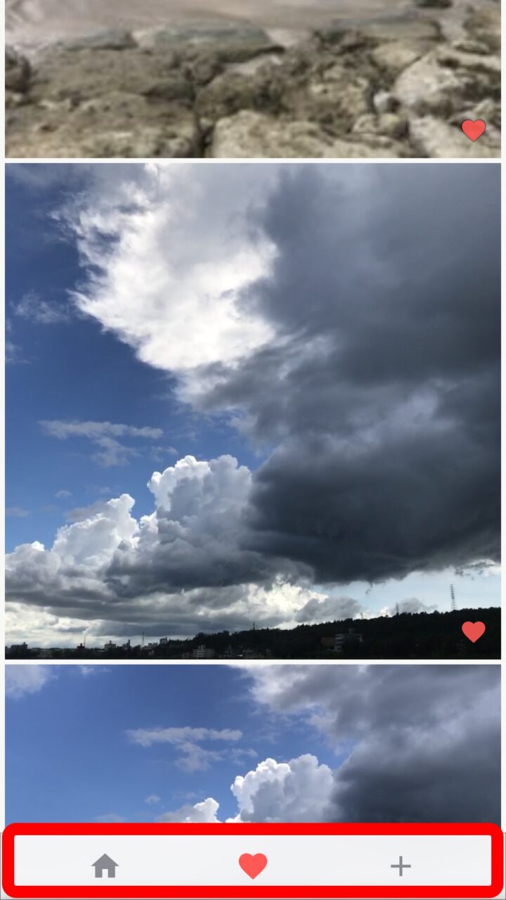 またお気に入りマークを付けた “クリップ” のみをフィルタリングして表示する方法は、画面下に表示されるメニューバーの真ん中にあるハートマークをタッチするだけです。これでお気に入りにした “クリップ” のみが表示されます。