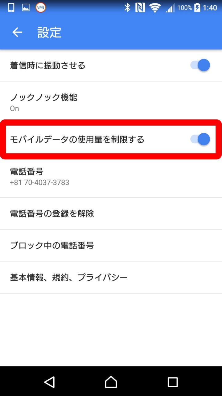 ちなみに、「Google Duo」ではモバイルネットワークを使用して利用するときに、“モバイルデータの使用量を制限する” が オン になっていると、自動でデータ速度が 1Mbps に下がる仕様になっています。これはデータ使用量を制限する一方、通話音質やビデオ品質が低くなる可能性があります。