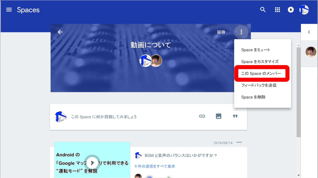 “招待リンク削除” 機能を利用する方法は、作成した “Space” のメニューアイコンをクリックして、“この Space のメンバー” をクリックします。
