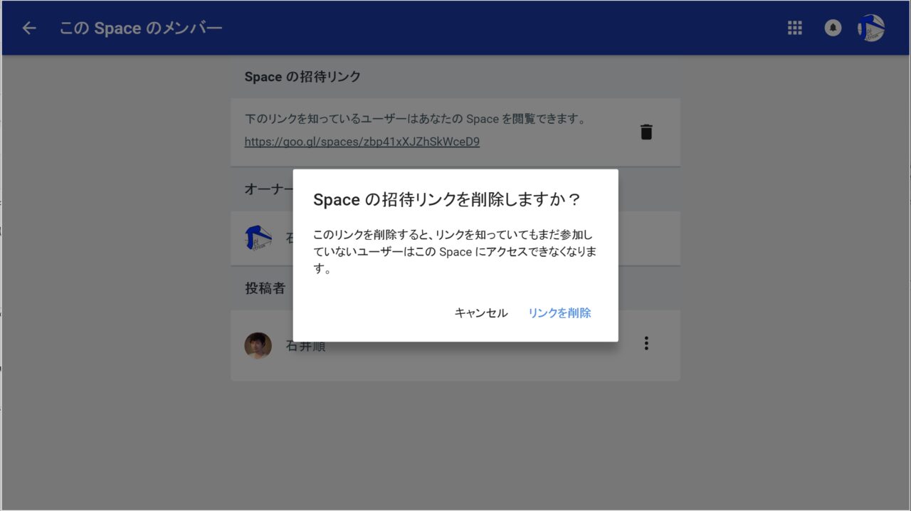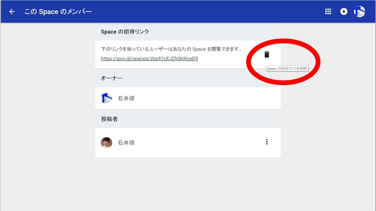 表示されるページの “Space の招待リンク” に表示されているゴミ箱アイコンをクリックし、アラートウィンドウで “リンクを削除” をクリックします。これで対象の “Space” への新規参加はできなくなります。
