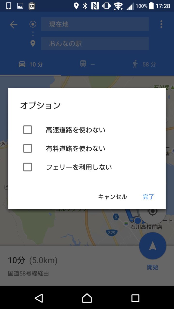 また、初期設定では、高速道路や有料道路を利用する経路が優先されているので、下の道で目的に向かう場合は、オプションをタッチして、各チェックボックスにチェックを入れてください。