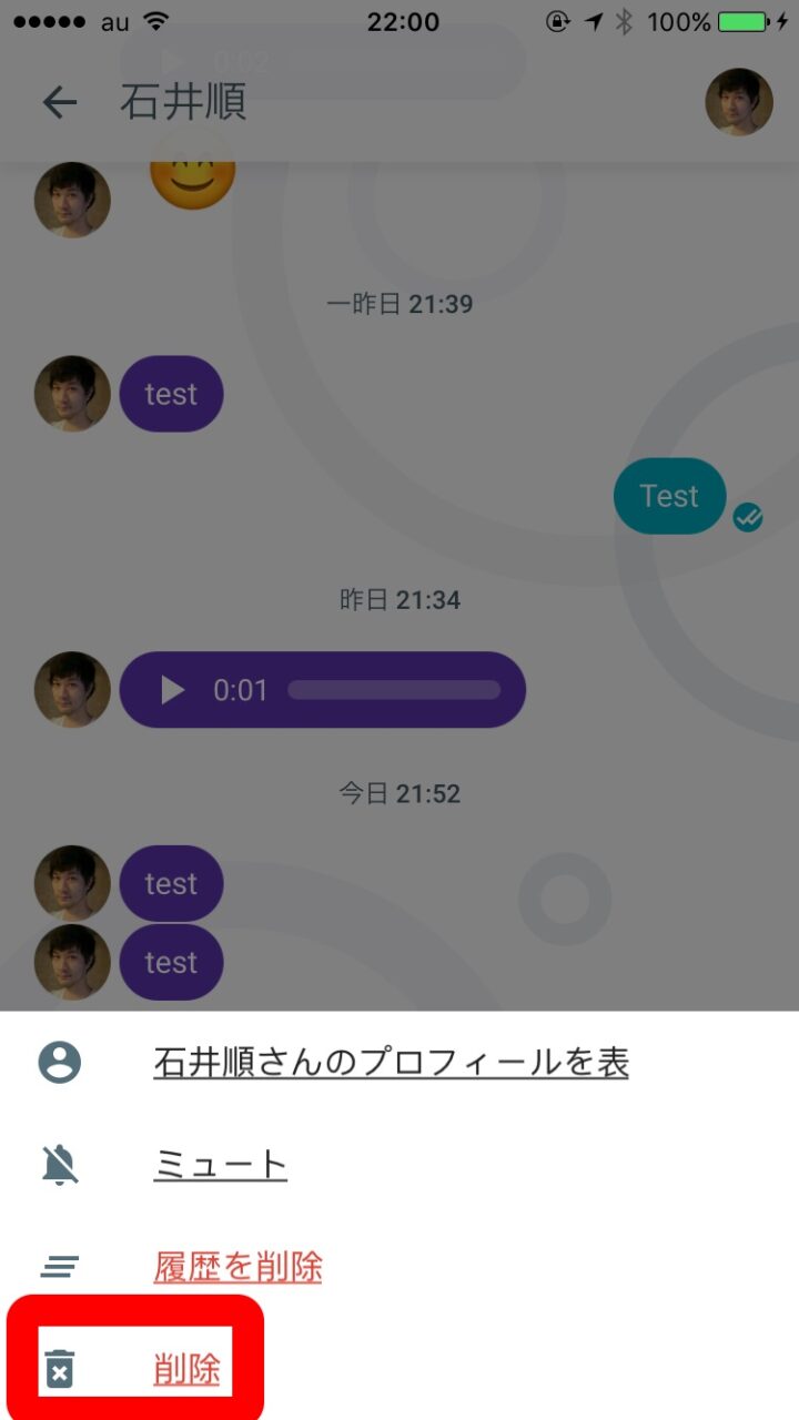 iPhone の場合は多少工程が異なります。削除するチャットを開き、右上のユーザーアイコンをタッチします。