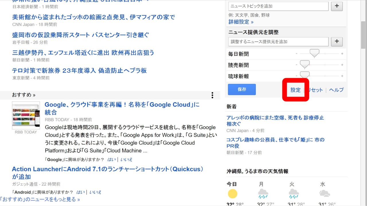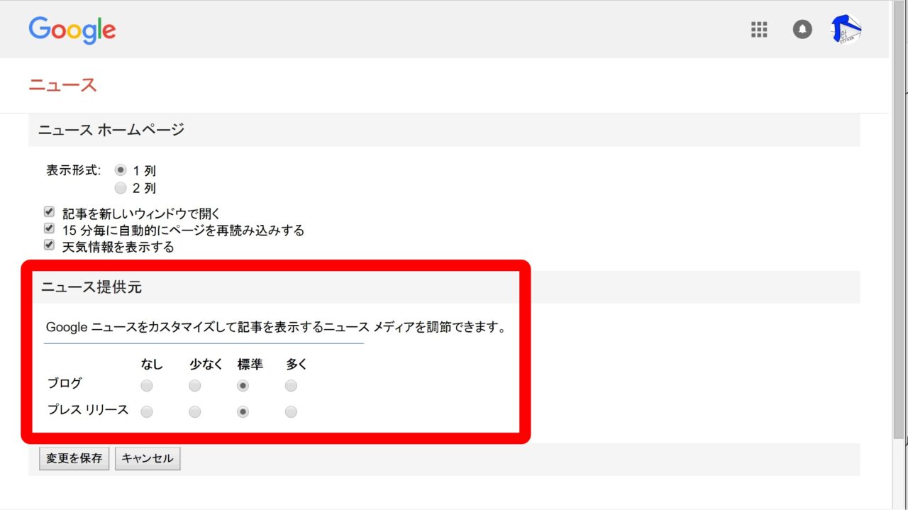 表示されたページの “ニュース提供元” の部分で、“ブログ” と “プレス リリーズ” の項目を、“なし” “少なく” “標準” “多く” から選択し、“変更を保存” をクリックします。これで完了です。