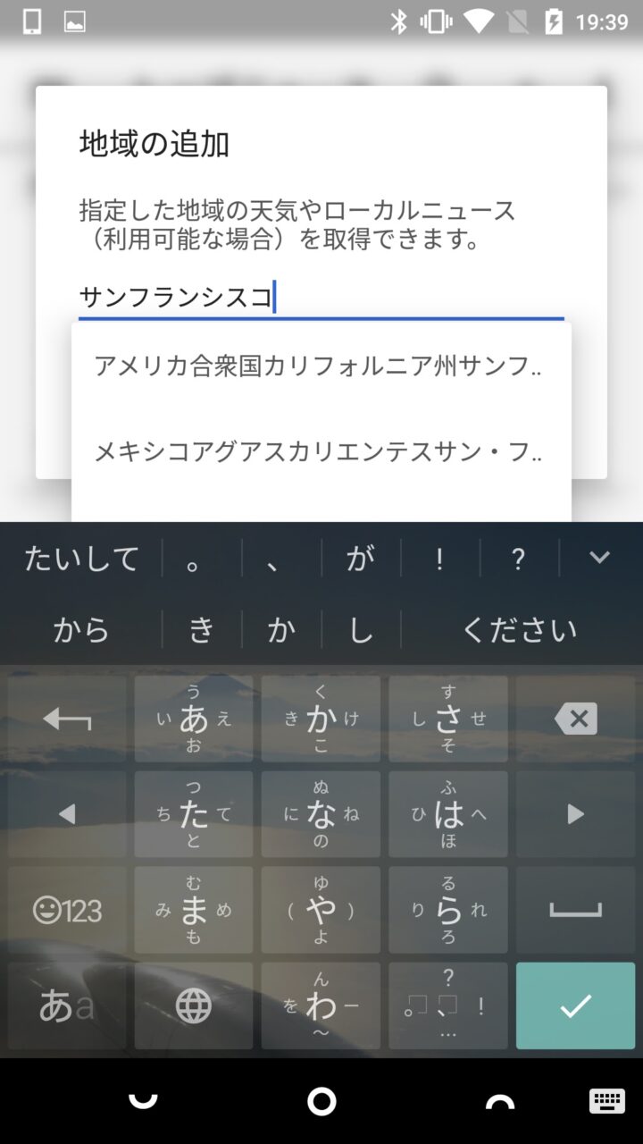 “地域の追加” ウィンドウが表示されるので、地域名や郵便番号などを入力し、表示される地域の候補から追加する地域をタッチします。