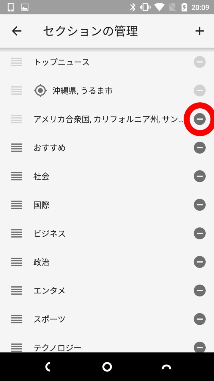 追加した “地域セクション” はスマートフォンアプリから簡単に削除することができます。“設定” から “セクションの管理” に進み、右端に表示される “∸” アイコンをタッチすることで行うことが可能です。