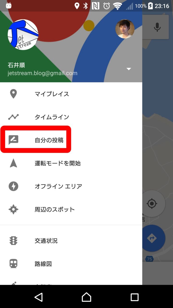“地域の情報の改善” は、「Google マップ」アプリを開き、メニューを表示して、“自分の投稿” をタッチすると “地域の情報の改善” として “投稿” タブの上部に表示されます。