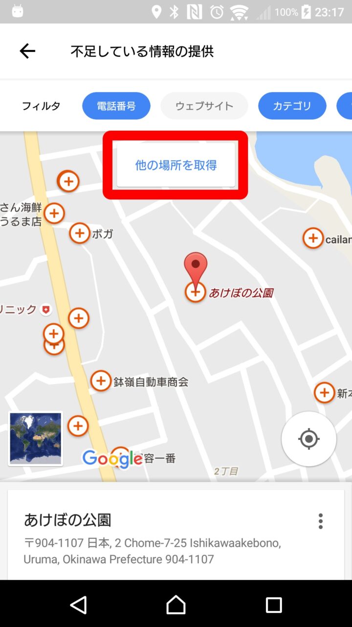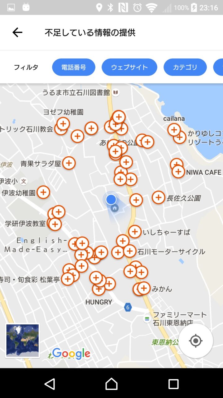 もし “+” アイコンが表示されない場合は、地図を移動したり、地図を縮小したりして “他の場所を取得” をタッチしてみてください。また逆に “+” アイコンが画面いっぱいに表示される場合などは、上部の “フィルタ” から条件を絞り込むことで、その条件の情報を必要としているスポットのみが表示されます。
