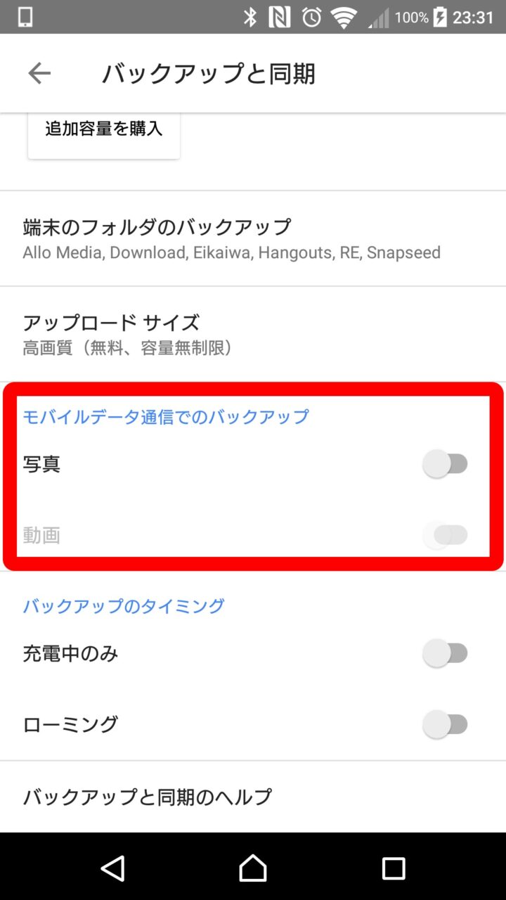 スマートフォン用「Google フォト」ではデフォルトでモバイルネットワークを利用してる時に、「Google フォト」のクラウドへのバックアップが行われない設定となっています。この設定はモバイルネットワークの通信量を抑えるための設定なので、モバイルネットワークを無制限で利用できるプランなどを契約していない限りは、基本的にはそのままの設定でよいでしょう。