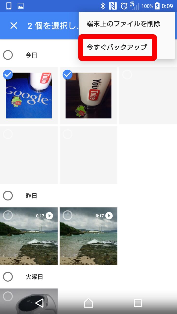 またバックアップする写真や動画が複数ある場合は一個一個バックアップを行う必要はなく、一覧画面でバックアップする写真や動画を複数選択し、右上のメニューアイコンから “今すぐバックアップ” をタッチします。
