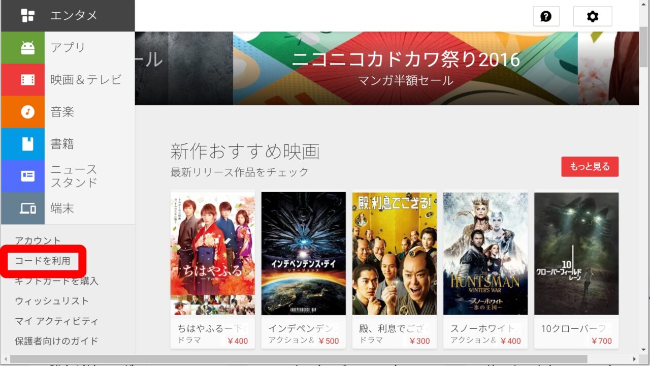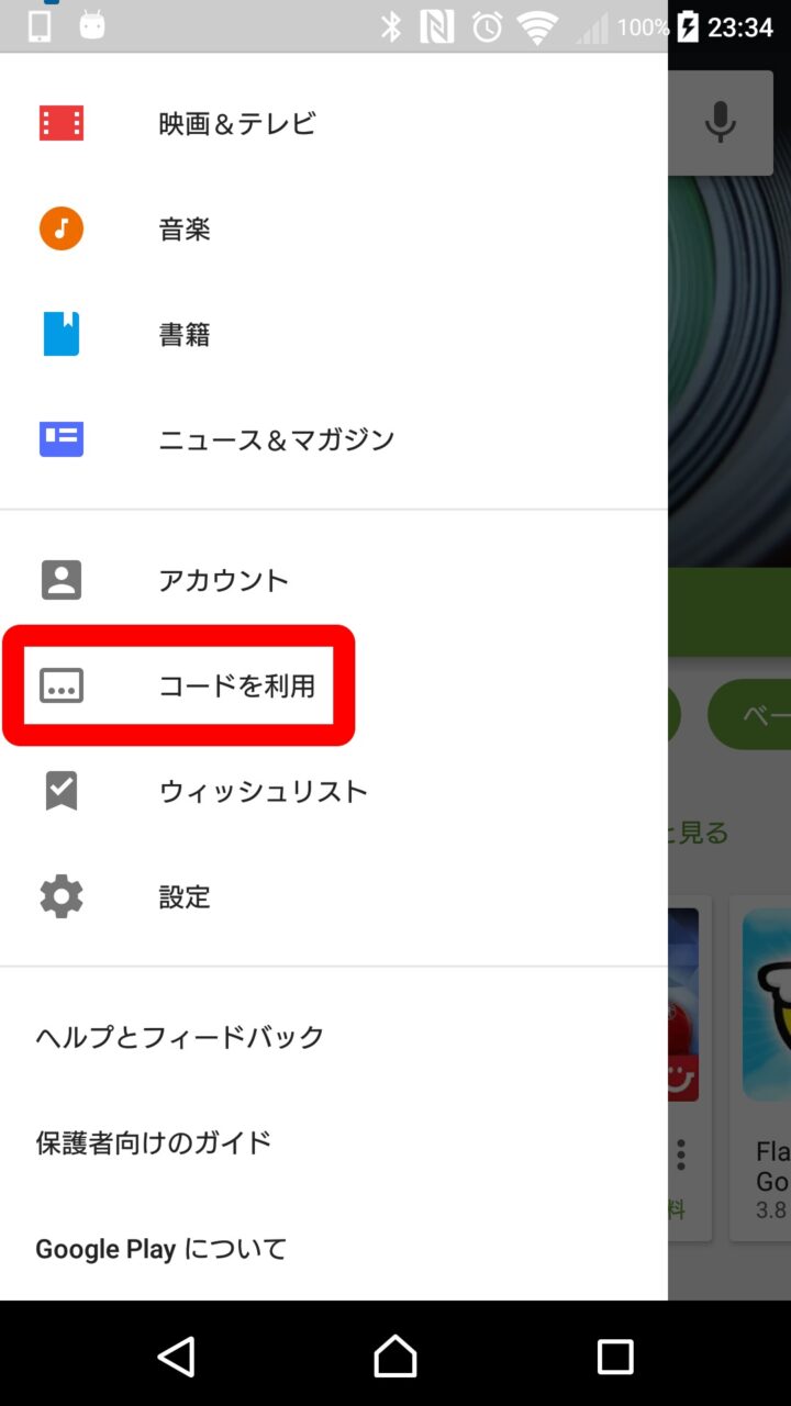 Android の場合は「Google Play」アプリ、デスクトップの場合は Google Play のサイト(play.google.com)を開きます。Android の場合はメニューから “コードを利用”、デスクトップの場合は左のメニューバーに表示される “コードを利用” を開きます。
