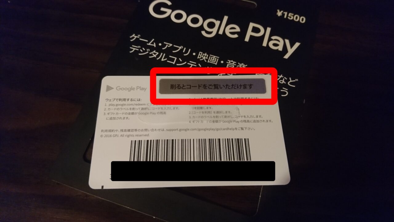まずは「Google Play ギフトカード」を購入するなどして入手されていることを前提とします。パッケージからカードをはがし、“削るとコードをご覧いただけます” の部分を削ってコードを入手してください。
