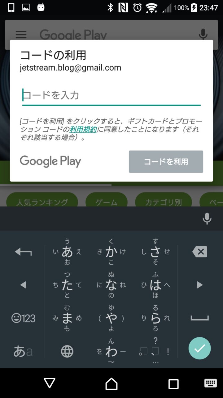 そして表示されるコード入力バーに、先ほど入手したコードを入力し、“コードを利用” をタッチ、またはクリックしてください。たったこれだけで Google アカウントに「Google Play ギフトカード」の残高がチャージされます。