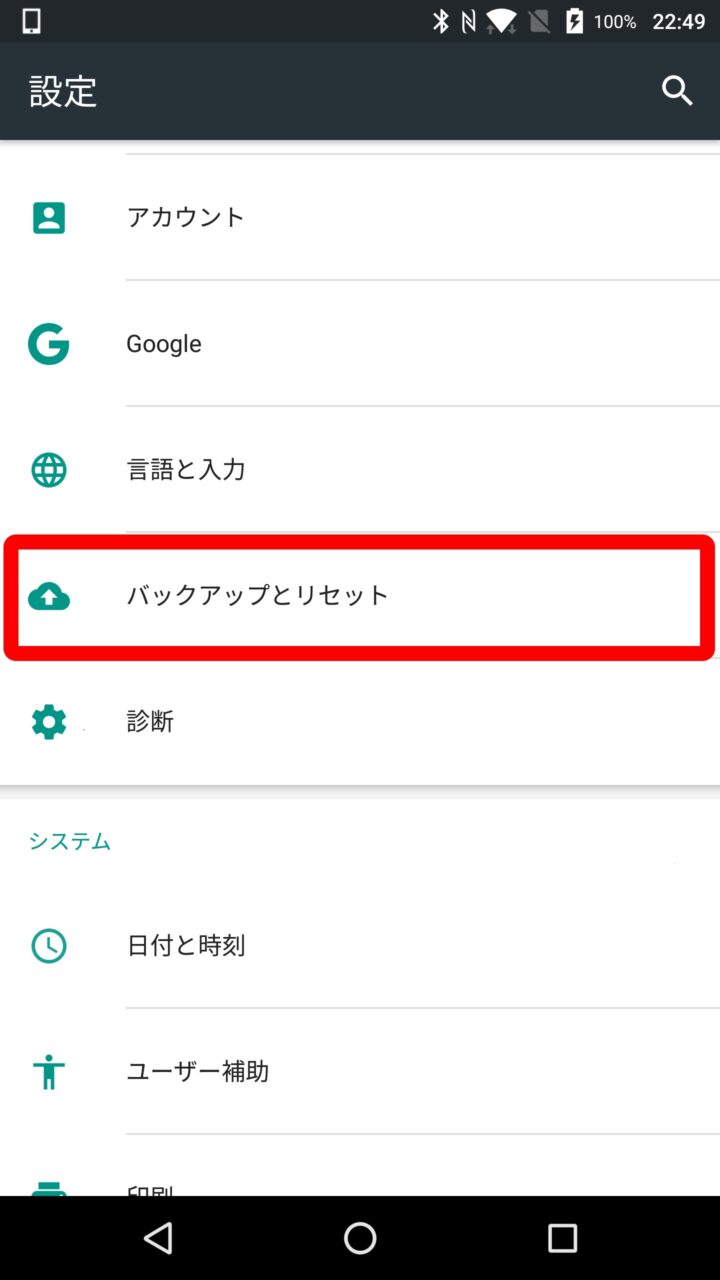 まずは Android の “設定” を開き、少し下に移動して表示される “バックアップとリセット” をタッチします。