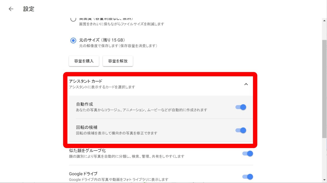 ただしこの “回転の候補” はあくまで任意のアシスタント機能となるので、設定で オン / オフ を切り替えることができます。“回転の候補” の設定項目は、メニューバーの “設定” から “アシスタント カード” を展開すると表示されます。