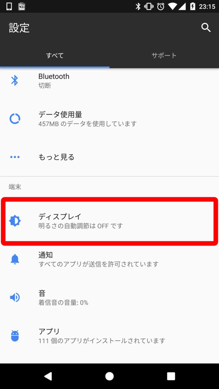Android の “明るさの自動調節” の設定項目は、Android の設定を開き、“端末” セクションにある “ディスプレイ” をタッチします。