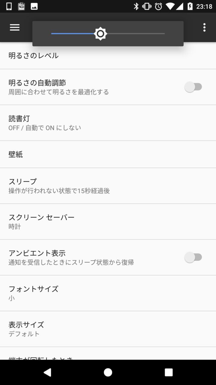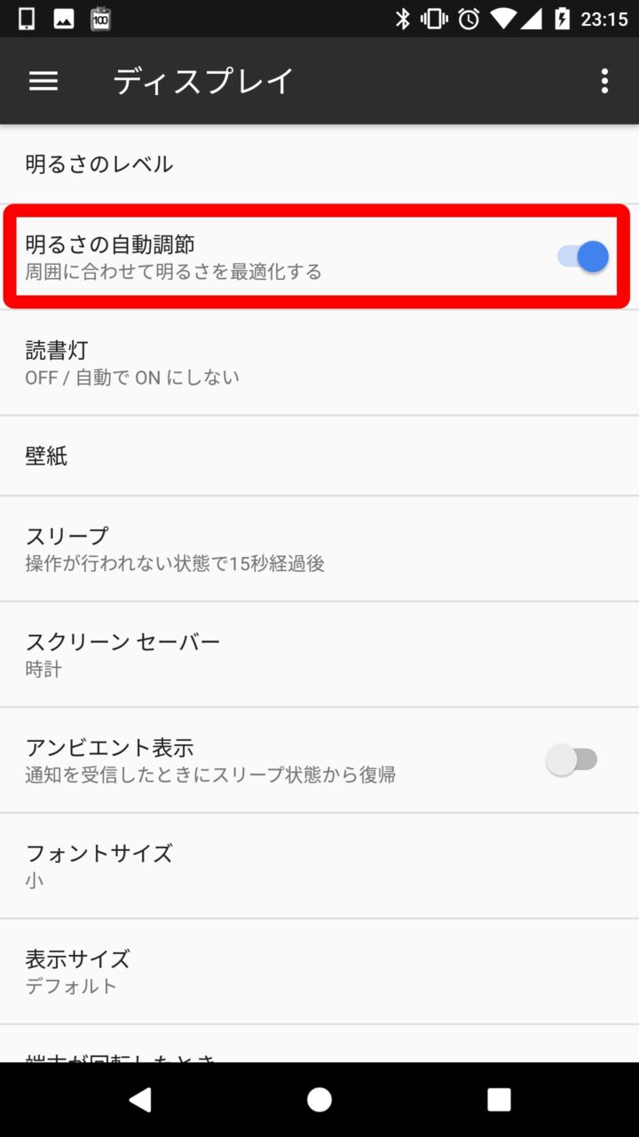 特に頻繁に Android の画面を見る場合や身近に充電環境がない場合などは “明るさの自動調節” を オフ にしておいた方が賢明と言えるでしょう。