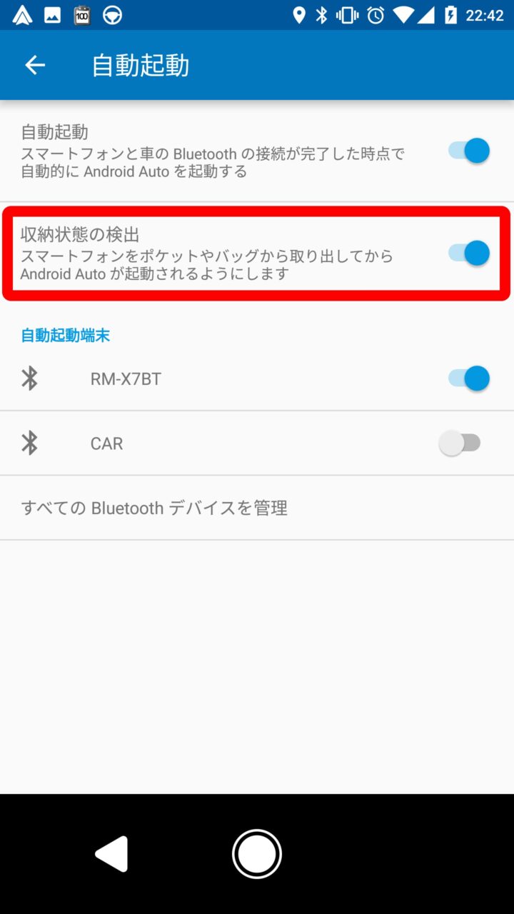 そして表示されたページの、“収納状態の検出” のスイッチを オン にします。これでポケットやバックに Android スマートフォンを入れている時は「Android Auto」が自動で起動しないようになります。