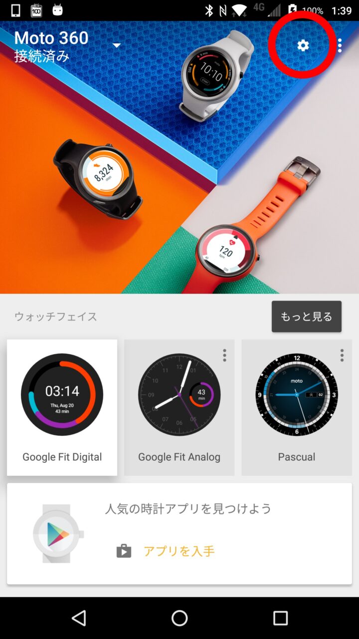 「Android Wear」スマートウォッチ装着時に Android スマートフォン側をマナーモードにする設定は、「Android Wear」アプリから簡単に行うことができます。まず「Android Wear」アプリを起動し、右上に表示される歯車マークをタッチします。