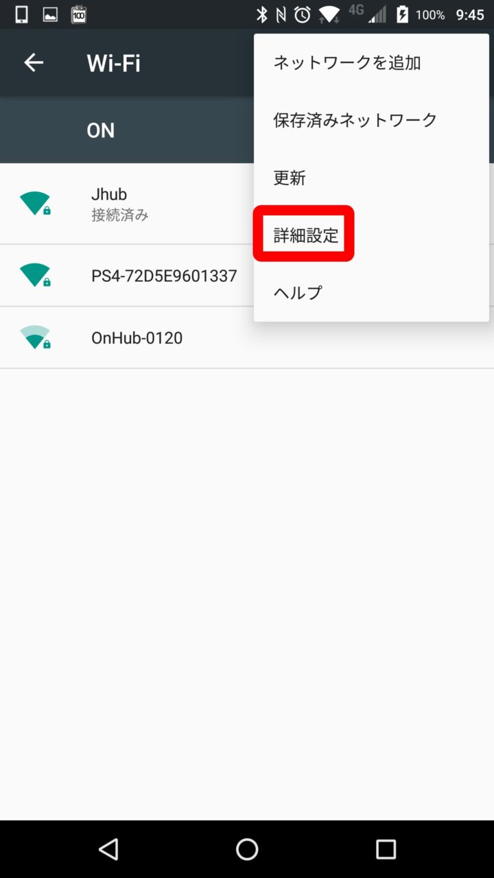 Android の WPS 接続項目は少しわかりにくい場所にあります。まず Android の設定などから “Wi-Fi” の設定を開きます。