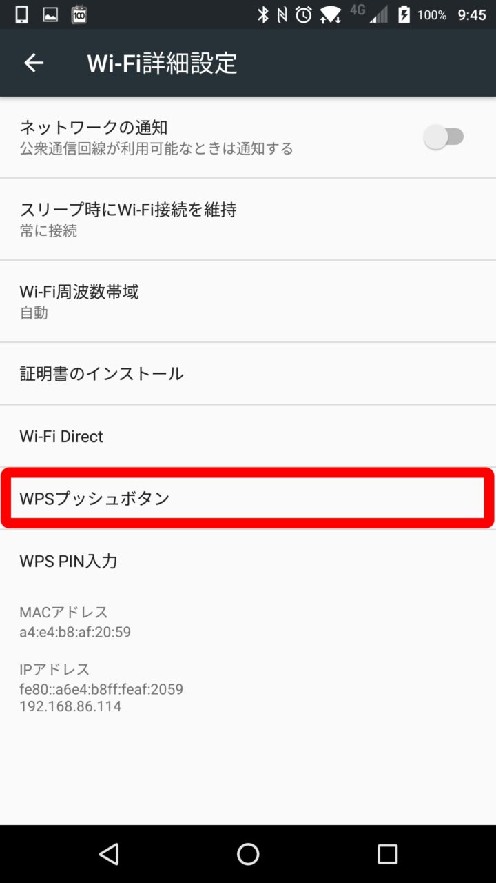 WPS は SSID やパスワードを入力せずに、簡単に Wi-Fi ルーターに接続できる機能で、Android に標準搭載されています。ただし WPS による簡単接続は Wi-Fi ルーター側に WPS ボタンが搭載されていないと利用することはできないのでご注意ください。