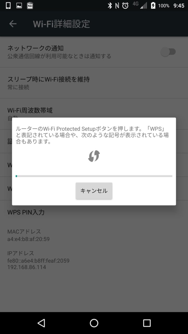 “詳細設定” ページの “WPS プッシュボタン” をタッチすると WPS 接続の待機状態となるので、Wi-Fi ルーター側に搭載されている WPS ボタンを押すなどして発信状態にします。※Wi-Fi ルーターによって操作は異なります