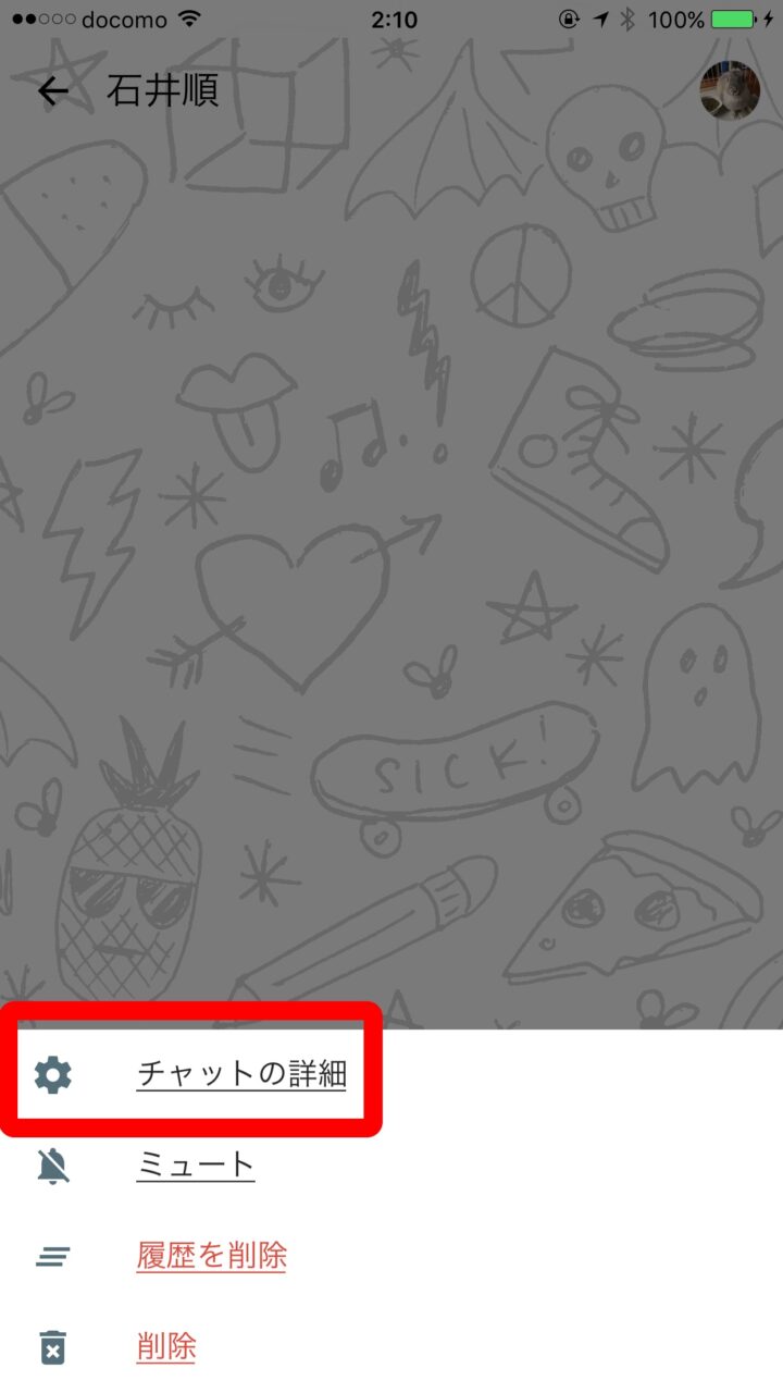 実際の変更方法は、チャット画面の右上に表示されるチャット相手のアイコンをタッチして、表示される “チャットの詳細” をタッチします。