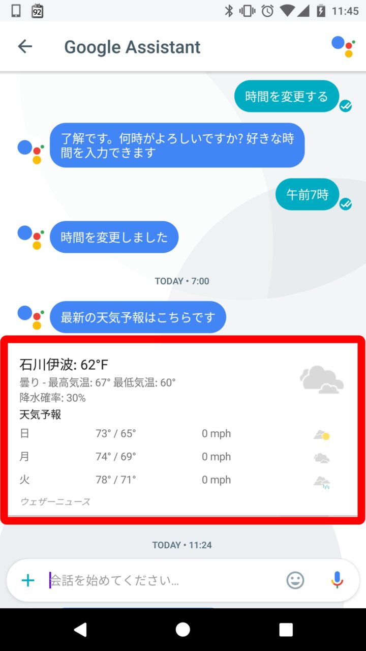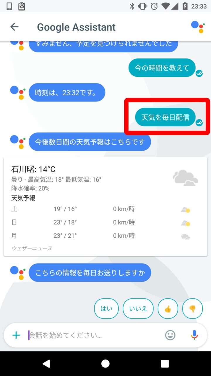 時間を設定したら完了です。これで設定した時間に設定した情報が、「Google Allo」の「Google Assistant」のチャットとして配信されるようになります。