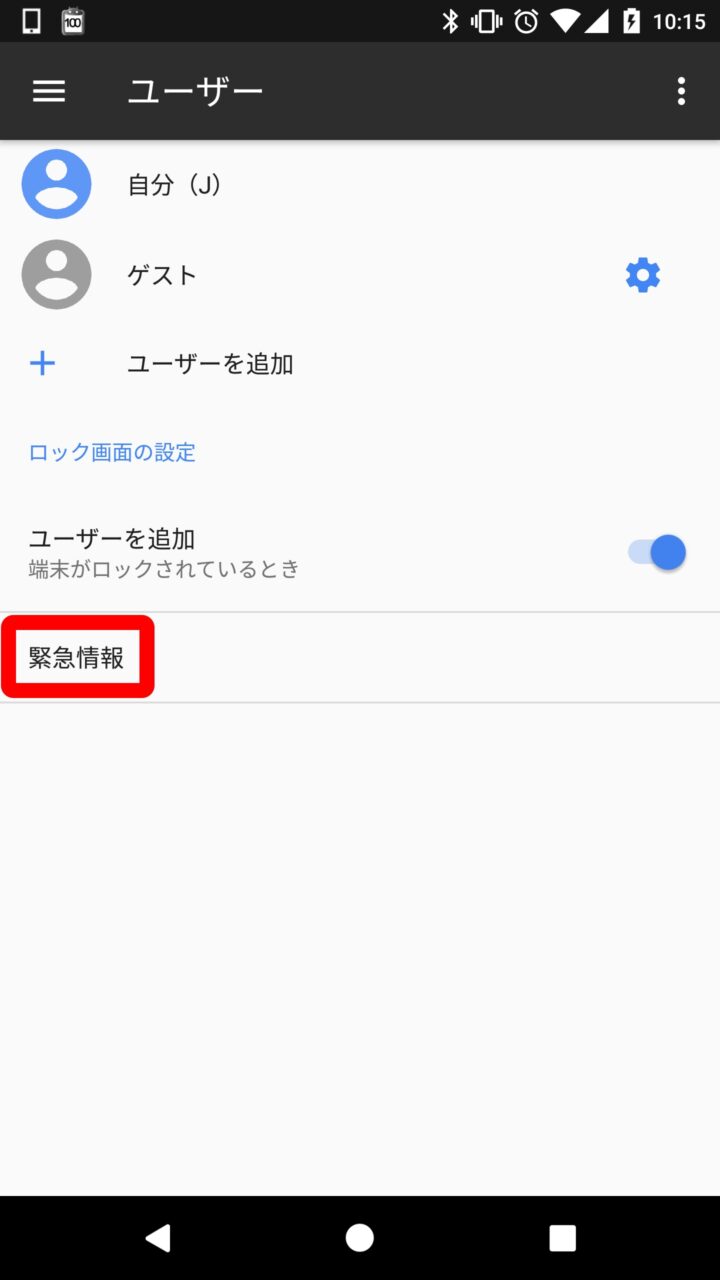 Android のロック画面に “緊急情報” を表示する設定は、Android の設定から “ユーザー” をタッチし、表示される “緊急情報” をタッチして、必要項目を入力するだけです。