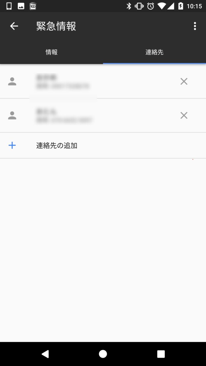 また “緊急情報” は “名前” や “住所” の “情報” タブと、緊急連絡先の “連絡先” タブに分かれています。“連絡先” は “連絡先の追加” をタッチして Android に登録されている連絡先から任意のユーザーを指定します。任意のユーザーは複数指定することが可能です。