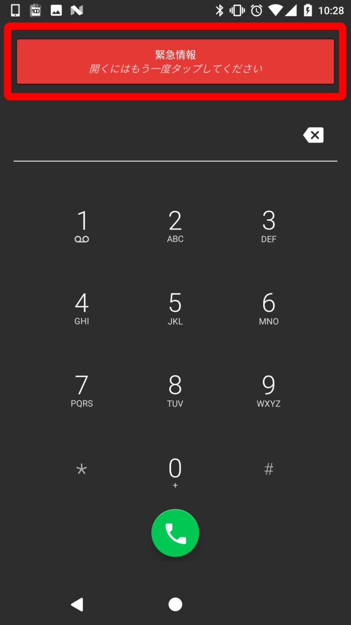 設定した “緊急情報” を実際に表示する方法は、Android のロック画面で “緊急通報” をタッチし、次に “緊急情報” を 2 回タッチします。